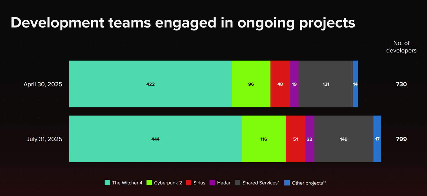 在续作方面,代号为 Orion 的赛博朋克 2077续集仍处于前期制作阶段,本季度新增 20 名开发人员专门参与该项目。公司其他研发项目也均有不同程度的扩展。此外,负责虚幻 5 引擎优化及跨项目工具开发的“共享服务团队”也在近期增加了 18 名成员。